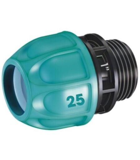 Raccord 25mm filetage 1" mâle Claber. De la gamme Claber, une réponse fonctionnelle et fiable pour le système d'irrigation souterrain "faites-le vous-même". Ce composant est utilisé pour ajuster à la presse un tuyau en polyéthylène à un début de ligne ou à une électrovanne. Pour raccorder un tuyau en polyéthylène à un départ fileté femelle ou à une électrovanne. Caractéristiques: Diamètre du filetage d'entrée : 1" Diamètre du tuyau : 3/4" ...