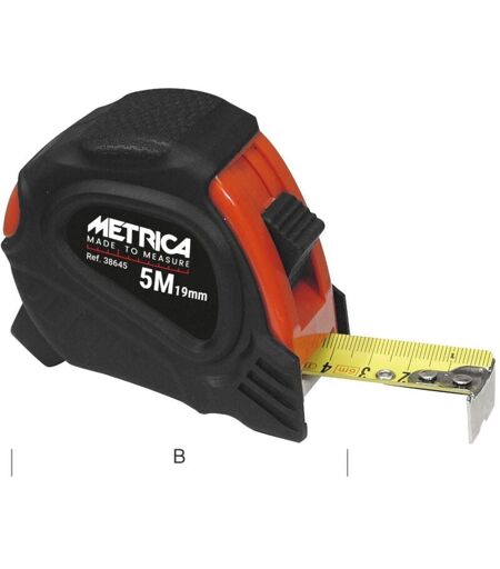 Mètre ruban de 5 mètres de long Epaisseur : 19 mm 3 boutons : Blocage permanent, blocage instantané, freinage ruban Ce mètre ruban vous permettra de mesurer avec précision jusqu'a 5 mètres de longueur max. Il est très utile sur un chantier, en magasin pour vérifier qu'un objet volumineux pourra être convoyé dans votre véhicule, ou tout simplement chez vous pour prendre n'importe quel type de mesure. Le ruban se caractérise par un aspect rigide qui lui permet de rester droit même si les 5 mètres sont déroulés. Le ruban est enroulé à l'intérieur du boitier, le boitier possède 3 boutons de blocage. Le premier permet un blocage permanent, un bouton situé sur le côté permet un blocage instantanée et le dernier bouton sert à freiner la rentrée du ruban. Longueur : 5m ...