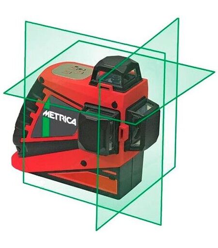 Niveau automatique laser vert (Réf. 61410). Projette 3 plans laser à 360°: un plan horizontal et deux plans verticaux à 90 ° les unes des autres. 4 équerrages aux murs. 2 croix, une au plafond et une sur le sol externe à la base de la structure pour le fil à plomb toujours visible. Vitres optiques. Haute visibilité. Positionnement facile au plafond ( Utilisation intérieure et extérieure (avec récepteur non inclus). Clignotement automatique du laser et avertissement sonore si l'appareil est hors de la plage d'auto-nivellement. Système de blocage intégrée pour éviter les vibrations lors du transport, possibilité de projeter les plans laser également dans une position inclinée fixe. Forme compacte, revêtement en caoutchouc antidérapant pare-chocs. Pile rechargeable Li-ion pour une longue durée ainsi qu'une pile de rechange et un chargeur pour la charge externe. En option: base sliding (glissements) avec possibilité de petits mouvements de glissement dans toutes les directions pour un positionnement rapide (réf. 61335). En option: support magnétique avec pince d'ouverture réglable pour le placement le long d'un mur (réf. 61340 et réf. 61440). Portée : 30 m. Portée avec récepteur : 50 m. Précision de nivellement : ±2 mm / 10 m. Plage d'auto-nivellement : ± 4°. Signal hors auto-nivellement : oui. Type de laser : 638 nm Puissance du laser : Classe II. Piles : Li-ion 3.7V 3400 mAh. Dimensions : 140 x 160 x 85 mm. Poids (sans piles) : 0,65 Kg. Étanchéité : IP 54. Filetage pour trépied : 1/4"- 5/8". Niveau laser : Niveau laser automatique Metrica 3D Vert ...