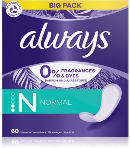 Always Daily Fresh Normal, 60 pcs, Serviettes hygiéniques pour femme, Sentez-vous libre même pendant vos règles. Les serviettes hygiéniques Always Daily Fresh Normal offrent une protection confortable pour que vous restiez confiante et sereine. Le produit : bonne respirabilité technologie qui assure l'absorption des odeurs taille adaptée aux jours de flux léger cœur absorbant qui retient le liquide à l'intérieur de la serviette idéal pour le sport et les loisirs coupe anatomique, s’adapte facilement à la forme de votre corps ...