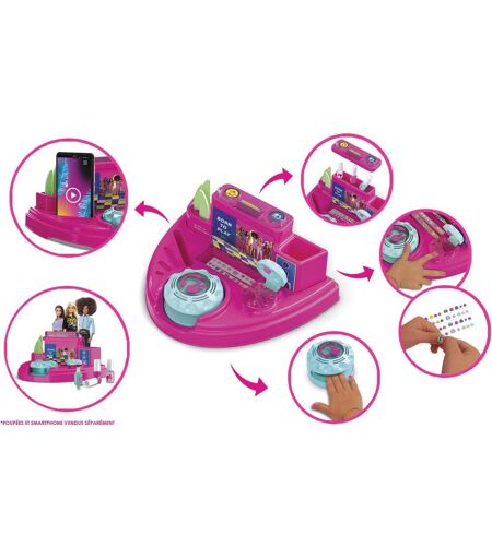 Studio à ongles Barbie. Vernis bio (ingrédients de source naturelle, sans danger et non toxiques) et éthique (sans ingrédients d'origine animale et non testé sur les animaux), développé dans le respect des normes "Clean Beauty". Contenu : Vernis à ongles (3 teintes) Un appareil à stickers pour ongles (30 stickers inclus) Un appareil pour sécher les ongles, Des limes à ongles, Un emplacement pour smartphone (non inclus). Set double compatibilité : s'utilise aussi comme console DJ avec une poupée (non incluse). L'appareil pour sécher les ongles fonctionne avec 2 piles LR03 / AAA (non fournies). ...