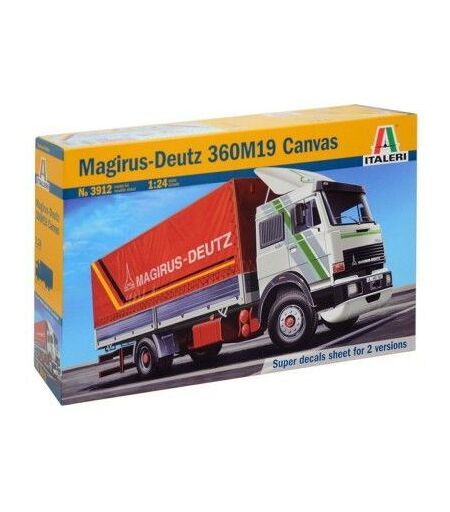 Maquette en plastique à monter et à peindre : Camion Magirus Deutz 360M19 Canvas. Peintures Italeri suggérées : 4696AP (Gloss White), 4606AP (Flat Red), 4768AP (Flat Black), 4605AP (Gloss Red), 4678AP (Metal Gloss Silver), 4682AP (Gloss orange). Longueur de la maquette montée : 37 cm. Échelle : 1/24. Age minimum : 15 ans ...