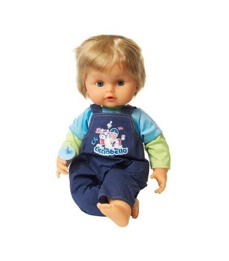 Jouez au jeu ""A Dada"" avec votre poupée Cicciobello ! Cicciobello parle, chante et demande à sa maman de jouer : 15 phrases et sons et il reconnaît 4 actions de jeux différentes. Cicciobello a le corps souple. Il s'exprime avec tendresse et affection, ce qui crée un lien très particulier avec sa petite maman. Dimensions de la boîte : 51 x 38,5 x 17 cm. Nécessite des piles : 3 x AAA, non incluses. ...