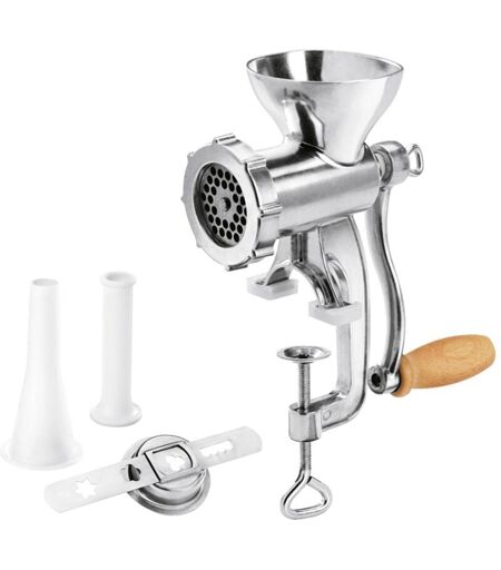 Description générale Le hachoir à viande Jack-5 de Metaltex est un appareil polyvalent fabriqué en aluminium coulé, idéal pour hacher la viande, les noix et les légumes. Il permet également de réaliser des pâtisseries et de remplir des saucisses grâce aux accessoires inclus. Ce hachoir robuste et durable se fixe facilement sur une table pour une utilisation stable et sécurisée. Spécifications techniques Couleur : argenté Matériau : aluminium Dimensions : 22 x 9 x 26 cm (l x P x H) Poids : 0,758 kg Diamètre des trous : 4,5 mm Type de produit : hachoir à viande Modèle : Jack-5 Référence : 251721000 Compatibilité et accessoires Inclut un disque en acier inoxydable de ø58 mm pour la viande Buse pour saucisses Accessoire pour pâtisserie Poussoir Installation Le hachoir se fixe facilement sur un plan de travail grâce à ses dispositifs de fixation intégrés. Assurez-vous que la surface est propre et stable pour garantir un fonctionnement sécurisé. Utilisation Ce hachoir est conçu pour : ...