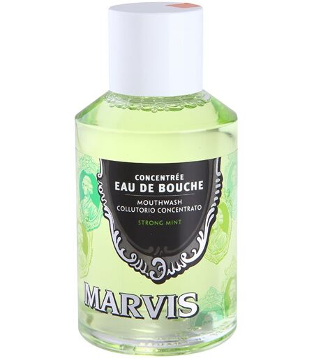 Marvis Strong Mint, 120 ml, Bains de bouche mixte, Le bain de bouche Marvis Strong Mint ne vous aide pas uniquement à rafraichir votre haleine, il agit également contre la plaque dentaire et aide à maintenir une bonne hygiène de la gencive et des dents. Le produit : lutte contre l’apparition de caries dentaires tue les bactéries maintient des gencives saines assure une haleine fraîche Mode d’emploi : Après le brossage des dents, rincez la bouche avec le bain de bouche pendant la durée indiquée sur l’emballage, rincez ensuite. ...
