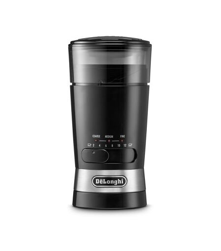 Moulin à café De'Longhi "KG210" compact et facile à utiliser avec des lames en acier inoxydable. COMPACT ET AMPLE Bien que le moulin à café soit extrêmement compact, il est possible de moudre jusqu'à 90 g de grains de café ou jusqu'à 12 portions à la fois. PLUS FACILE À UTILISER - 3 NIVEAUX DE MOUTURE ET NOMBRE DE TASSES PRÉDÉFINI Le niveau de broyage varie en fonction de la durée du broyage : plus le processus est long, plus le niveau de broyage est fin. Pour faciliter le suivi, le moulin à café dispose de 3 leds, indiquant quand l'un des 3 niveaux de mouture est atteint : grossier, moyen et fin. Il est également possible de régler le nombre de portions à moudre (de 2 à 12 tasses) à l'aide du sélecteur de tasse. Le moulin à café démarre le processus de mouture en poussant le couvercle. FACILE À ENTRETENIR Le récipient amovible pour les grains/le café prémoulu et la brosse de nettoyage facilitent le maintien de la propreté du moulin à café. ...