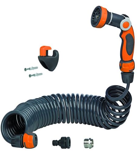 Ewuaqua Tuyau D'Arrosage Spirale 10 m complet 72008 composé de: 1x douchette multifonctions 8 Jet Basic Plus Tuyau d'arrosage spiralé de 10 m 1x morceau de tuyau 1/2" soft touch 1x arrêt d'eau 1/2" soft touch 1x adaptateur de robinet d'intérieur 1x raccord de robinet 1/2"-3/4" ...