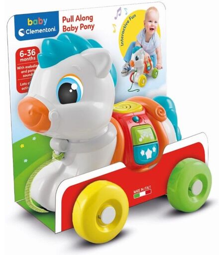 Un adorable poney a tirer que Bébé pourra emmener partout. Le joli poney est doté de plusieurs boutons sur la selle, le faisant manger, rire et amusant l'enfant avec des effets sonores. Avec les boutons interactifs, les roues et la cordelette, le poney soutient le développement sensoriel, ainsi que l'amélioration des capacités motrices. ...