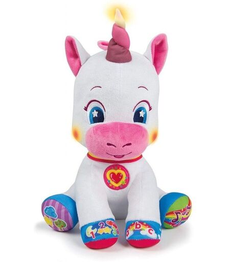 Licorne en peluche interactive pour jouer dans un monde de douceur. Cette jolie licorne divertira les enfants avec de nombreux effets sonores et lumineux et les amènera à découvrir les premières lettres et premiers chiffres de manière simple et engageante. Développer la perception visuelle et auditive, la dextérité et les gg langage. ...