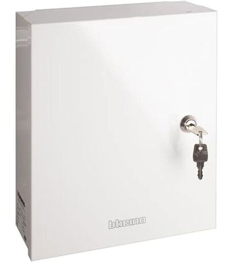 Boîtier métallique Bticino présentant les caractéristiques suivantes : Tension 110-240Vac Courant dans 400mA Couleur : blanc Absorption : 0,4A max Avec ouverture latérale et fermeture à clé Équipé d'un porte-fusible et d'un fusible de 2A, d'un micro-interrupteur anti-arrachement et d'une alimentation à découpage de 1,7A déjà câblés. Idéal pour les unités de contrôle art. 4204 et art. 4200 Batterie logée : 7,2A/h ; 12V Dimensions : Hauteur 295 mm - Largeur 255 mm - Profondeur 85 mm Certification : EN 50131 Grade 3 Classe environnementale II Typologie : Conteneurs ...
