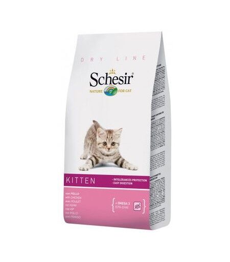 Croissance optimaleLa composition de ces croquettes est idéale pour la bonne croissance de votre chaton. Leur formule assure : le développement du système immunitaire et cérébral une digestion facile le bon développement de l' appareil locomoteur et une solide ossature un faible risque d'allergie en utilisant la pomme de terre comme ingrédient la bonne santé du système urinaire une peau saine, une pelage doux et brillant l' élimination des poils ingérés grâce aux fibres la réduction du dépôt de tartre Schesir pour la natureAu delà de la haute qualité de ses aliments, Schesir prend soin des animaux en s'affichant contre les tests invasifs et cruels sur les animaux et en optant pour des techniques de pêche durable, et suit un parcours écodurable en participant à des programmes de création et d'entretien de forêts pour compenser les émissions de CO2 provenant de son activité sur internet.Ingrédients26% de protéines animals transformées (viande déshydratée de poulet), riz, graisse de porc purifi ée, orge, gluten de maïs, protéine de pomme de terre, pulpe de betterave déshydratée, huile de foie de morue, ovoproduits déshydratés, graines de lin, 1% de fructooligosaccharides (FOS), 1% de pulpe de chicorée déshydratée, 1% de levure de bière, farine de petits pois, pyrophosphate de sodium, chlorure de potassium, 0,3% de produits obtenus à partir de la transformation de plantes (aloe vera, psyllium, romarin, calendula, camomille, thé vert, fenouil, ortie, curcuma), 0,1% de yucca schidigera. ...