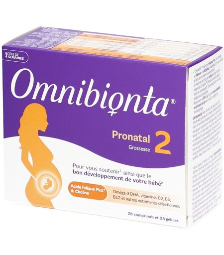 Complément alimentaire à utiliser dans le cadre d’une alimentation variée, équilibrée et d’un mode de vie sain.Omnibionta® Pronatal 2 Grossesse est un complément alimentaire. Destinée à être utilisée durant la grossesse, cette formule apporte une dose élévée de vitamine D ainsi que des folates (dont la Metafolin®). Elle comporte également des acides gras oméga-3 qui contribuent au développement normal du cerveau et des yeux du foetus*.* L'effet bénéfique est obtenu par un apport quotidien de 200 mg de DHA en plus de l'apport quotidien recommandé en acides gras oméga-3 pour les adultes, à savoir 250 mg de DHA et d'EPA.BénéficesContient des quantités spécifiques et adaptées de folates (dont la Metafolin®), de vitamines, de minéraux et de DHA (des acides gras oméga-3) pour la grossesseLes acides gras oméga-3 contribuent au développement normal du cerveau et des yeux du foetus*1 comprimé par jour composé d'acide folique, de Metafolin® et d'autres vitamines et minéraux essentiels + 1 gélule par jour de 200 mg de DHA (oméga-3)Boîte contenant 84 comprimés et 84 gélules (12 semaines)IngrédientsComprimé : Bitartrate de choline ; oxyde de magnésium ; agent de charge : cellulose microcristalline ; vitamine C; bisglycinate de ferreux ; agents d’enrobage: hydroxypropylméthylcellulose; agent de charge : carboxyméthylcellulose sodique réticulée ; antiagglomérant : phosphate de calcium ; amidon ; agents d’enrobage : hydroxypropylcellulose, alcool polyvinylique, polyéthylène glycol, talc ; vitamine B3 ; maltodextrine ; oxyde de zinc ; colorants : carbonate de calcium, oxyde de fer (rouge) ; antiagglomérant : sels de magnésium d’ acides gras ; vitamine E ; vitamine B5 ; émulsifiant : gomme d’ acacia ; sucre ; sirop de glucose ; amidon modifié ; vitamine B6 ; sulphate de cuivre ; vitamine B1 ; vitamine B2 ; L-méthylfolate de calcium ; acide ptéroylmonoglutamique ; iodure de potassium ; sélénate de sodium ; D-biotine ; vitamine D ; vitamine B12.Gélule : huile de POISSON riche en DHA ; gélatine (bovine) ; huile de tournesol raffinée (Helianthus annuus.); humectant : glycérol ; antioxydant : extrait riche en tocophérol.Allergènes : Poisson.Valeurs nutritionnellesVitaminesPar comprimé% VNR*Folate400 µg200 %Acide folique200 µg L-méthylfolate208 µg Vitamine B11,4 mg127 %Vitamine B21,4 mg100 %Vitamine B315 mg94 %Vitamine B56,0 mg100 %Vitamine B61,9 mg136 %Vitamine B124,5 µg180 %Biotine40 µg80 %Vitamine C55 mg69 %Vitamine D20 µg400 % Vitamine E (α-TE)4,8 mg40 %MinérauxPar comprimé% VNR*Cuivre0,8 mg80 %Iode150 µg100 %Fer14 mg100 %Magnésium75 mg20 %Sélénium30 µg55 %Zinc8,0 mg80 %AutrePar comprimé% VNR*Choline130 mg DHA200 mg *Valeurs nutritionnelles de référenceConseils d'utilisationPrendre 1 comprimé et 1 gélule par jour. À avaler avec une boisson froide, de préférence pendant le repas de midi. Il est conseillé de commencer à utiliser Omnibionta® Pronatal 2 dès le moment où la grossesse est confirmée, et de passer à Omnibionta® Postnatal+ après la naissance, jusqu'à la fin de... ...