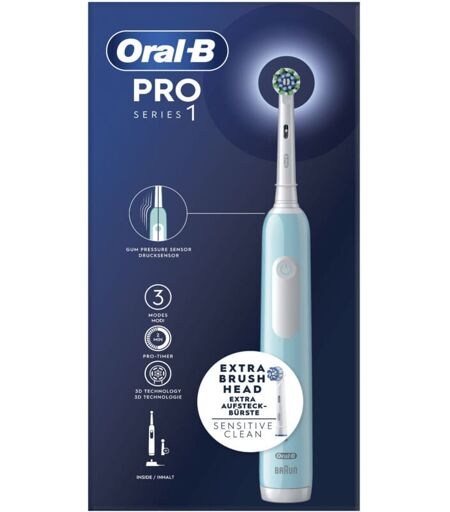 Oral-B Pro Series 1. Utilité: Adulte, Type de brosse à dents: Brosse à dents oscillante, Couleur du produit: Bleu, Blanc. Source d'alimentation: Batterie, Type de batterie: Batterie intégré. Type d'emballage: Boîte avec crochet. Nombre de poignées fournis: 1 pièce(s), Nombre de têtes de brossage incluses: 2 pièce(s) ...