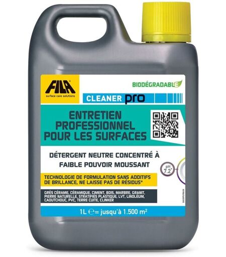 1 litre - Fournisseur: FILA - Reference: 60510012 - - Détergent concentré neutre pour grès cérame, céramique émaillée, terre cuite, grès étiré, ciment, bois, pierre et agglomérés polis, stratifiés plastiques, linoléum, caoutchouc et pvc - Adapté au nettoyage quotidien de tous les types de sols en céramique, terre cuite et pierres naturelles - N'agresse pas la couche de protection - Idéal pour l'entretien de toutes les surfaces cirées - Ne nécessite aucun rincage - Parfum agréable - Dilution : de 1:30 à 1:200 selon le besoin - Rendement : pour un litre de produit : 200 m² (nettoyage intensif), 1500 m² (nettoyage quotidien) ...