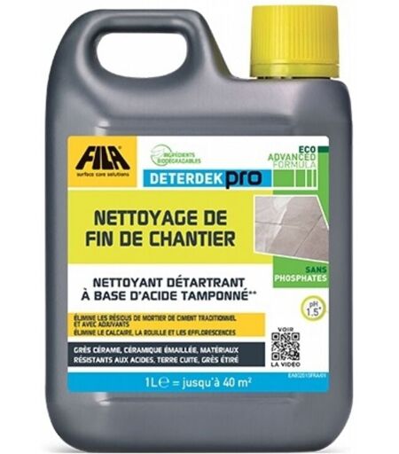 Description générale Le désincrustant acide DETERDEK Pro de la marque FILA est un produit efficace pour le nettoyage de fin de chantier. Conçu pour éliminer les résidus après la pose et les salissures, il agit en profondeur sur divers types de surfaces, y compris les sols extérieurs. Spécifications techniques Contenance : 1 L Type de produit : Désincrustant acide Destination : Sols, murs, sanitaires Type de revêtements compatibles : Terre cuite, grès cérame, céramique émaillée, pierres résistantes aux acides, clinker Compatibilité et accessoires Compatible avec divers matériaux tels que : Terre cuite Grès cérame Céramique émaillée Pierres résistantes aux acides Ne pas utiliser sur les marbres polis ou matériaux sensibles aux acides. Installation Aucune installation requise, prêt à l'emploi après dilution. Utilisation Dilution : de 1:5 à 1:10 selon les salissures à éliminer, 1:3 pour les résidus des joints avec adjuvants. Application : Mouiller la surface avec de l'eau. Appliquer ...