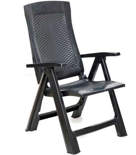 Fauteuil pliant en résine anthracite effet rotin, 100% recyclable, résistant aux agents atmosphériques, moisissures, smog et poussière. Il est équipé d'accoudoirs et d'un dossier confortable à plusieurs positions. Ne convient pas aux surfaces parfaitement lisses et même pas à un usage professionnel. Pesant 6,5 kg et mesurant 59x67x106 cm. Modèle doré, marque Progarden ...