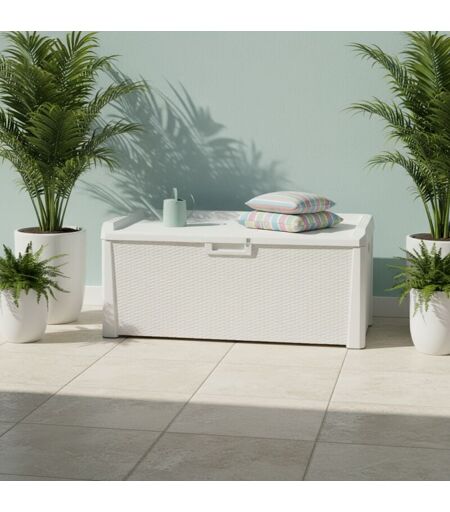 Ce grand coffre banc en résine est idéal pour stocker vos gros accessoires de jardin grâce à sa grande capacité de stockage. Son esthétique effet rotin l'intégrera facilement dans votre jardin. Il nécessite peu d'entretien. Sa forte résistance aux UV et à l'eau, le rend résistant aux intempéries, pouvant rester à l'extérieur tout au long de l'année. Caractéristiques techniques : Dimensions ext. Hors tout (L x P x H) : 148 x 72 x 64 cm Dimensions intérieures : 139 x 62,5 x 53 cm Capacité : 550 L Poids : 18,30 kg Matériaux : Polypropylène 100% recyclé Coloris : Blanc Capacité d'assise : 2 personnes Résistance de charge : 360 kg Ouverture et fermeture aidée par piston pneumatique Fermeture avec cadenas < 6 mm (non inclus) Montage avec outils (non inclus) Made in Italy Traité anti-UV Les + du produit : Facile et rapide à assembler Sans entretien Verrouillable Caractéristiques logistiques : - Dimensions colis (L x P x H) : 150 x 22 x 77 cm - Poids : 22 kg ...