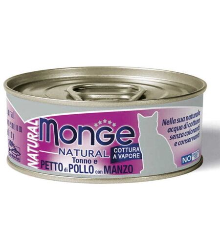 Monge Chat Thon au Blanc de Poulet et Bœuf 80g Monge Chat Adulte Thon au Blanc de Poulet et Bœuf est un aliment complémentaire cuit à la vapeur destiné aux chats adultes. Contient du thon, du blanc de poulet et du bœuf de haute qualité - une source de protéines à haute valeur nutritionnelle et digestible. La recette enrichie en fructo-oligosaccharides (FOS) favorise le bon fonctionnement intestinal. Aliment sans colorants ni conservateurs ajoutés, ne contient pas de céréales. COMPOSITION : Thon albacore 45 %, poulet 26 %, bœuf 5 %, riz 1 %, FOS (fructo-oligosaccharides). CONSTITUANTS ANALYTIQUES : protéines brutes 18 %, fibres brutes 0,5 %, matières grasses brutes 1 %, cendres brutes 1 %. humidité 79 %. ADDITIFS : Additifs nutritionnels/kg : Vitamine E (acétate de DL-alpha-tocophéryle) 50 mg. MODE D'EMPLOI : Servir à température ambiante ou réchauffé. Après ouverture, conserver au réfrigérateur et consommer dans les 2 jours. Conseils d'alimentation : Apports journaliers recommandés ...