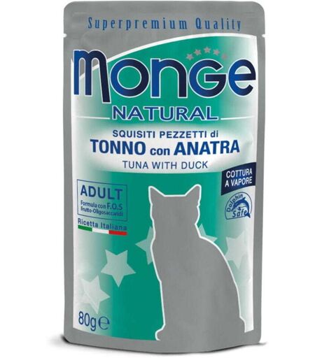 Monge Cat Tuna Chunks with Duck 80g Monge Adult Cat Thon Chunks with Duck est un aliment complémentaire cuit à la vapeur destiné aux chats adultes. Contient du thon et du canard de haute qualité - une source de protéines à haute valeur nutritionnelle et digestible. La recette enrichie en fructo-oligosaccharides (FOS) soutient une fonction intestinale normale. Nourriture sans colorants ni conservateurs ajoutés, ne contient pas de céréales. COMPOSITION : Thon de l'Indo-Pacifique (Euthynnus Affinis) 45 %, canard 5 %, riz, FOS (fructo-oligosaccharides) 0,04 %. CONSTITUANTS ANALYTIQUES : Protéines brutes 12 %, fibres brutes 1,0 %, matières grasses brutes 1,0 %, cendres brutes 2,0 %, humidité 83,0 %. ADDITIFS : Additifs nutritionnels/kg : Vitamine E (acétate de DL-alpha-tocophéryle) 50 mg. MODE D'EMPLOI : Servir à température ambiante ou réchauffé. Après ouverture, conserver au réfrigérateur et consommer dans les 2 jours. Conseils d'utilisation : Apport journalier recommandé pour un chat de ...