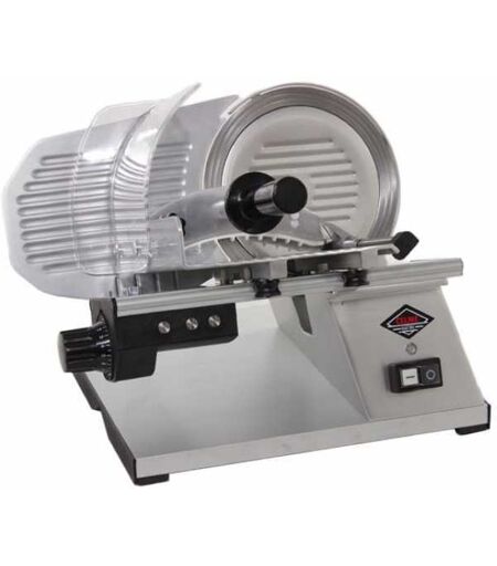 Certifications CE professionnelle, Matériau de la lame de coupe acier trempé, Diamètre lame de coupe 220mm, Matériau de la base aluminium anodisé, Matériau de la voile aluminium, Pays de fabrication Italie, Trancheuse sur niveau, Conseillée pour: Charcuteries tendres, Conseillée pour: Charcuteries affinées, Conseillée pour: Viandes, Conseillée pour: Pain de mie, Conseillée pour: Fromages semi-affinés, Conseillée pour: Légumes, Type de moteur électrique monophasé, Puissance nominale (W) 140W, Couplage moteur/lame , Type de transmission directe à engrenages, Plateau couvre-lame amovible par poignée de déplacement, Matériau du chariot aluminium, Affûteur - amovible ...