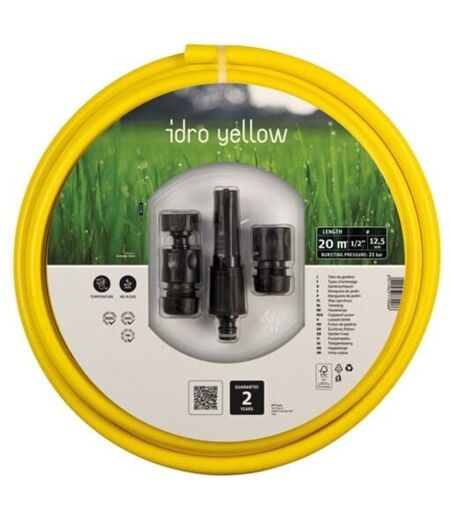 Comprenant un tuyau guipé en pvc 3 couches. Revêtement extérieur de couleur jaune couvrante, renfort textile guipé, couche intérieure noire anti algues et anti UV avec 1 set de raccords plastique et 1 lance.Résiste de -10 C à +40 C. Garantie 2 ans. CARACTERISTIQUESFiche produit constructeur / fournisseur : https://static.findis.fr/data/articles/1151250/fiche-produit-2314.pdf ...