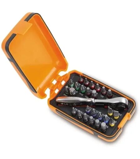 25 embouts pour tournevis, 1 raccord et 1 cliquet réversible dans un étui de poche. Support : 1/4 Type : Assortiment Contenu de l'assortiment : Beta 860/55, beta 860lp mm 0,5x3-1,0x5,5-1,2x6,5 - beta 860pe mm 2-2,5-3-4-5-6, beta 860ph 1-2(x2)-3, beta 860pz 1-2(x2)-3, beta 860tx 6-8-10-15-20-25-30 -40 et beta 892/0 Pièces par paquet : 27 ...