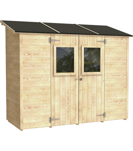 Structure en bois, Largeur abri 245cm, Profondeur abri 102cm, Hauteur abri 222cm, Typologie toit Un pan, Typologie porte Deux battants, Pour outils, Pour tondeuse, Pays de fabrication Italie, Nombre de fenêtres 2, Tête imperméable, Avec plancher ...