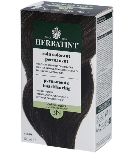 Une coloration capillaire inspirée par la nature avec une couverture à 100 % des cheveux gris ? Herbatint propose 27 nuances différentes de gels de coloration capillaire sans ammoniaque et avec une couverture à 100 % des cheveux gris. La coloration capillaire est axée sur la coloration naturelle, la nutrition et la protection optimale des cheveux. La coloration capillaire contient une formule unique et douce et est enrichie de 8 extraits de plantes, dont l'aloe vera, l'hamamélis, l'échinacée et le noyer. La formule contient également une faible concentration de peroxyde d'hydrogène. Herbatint 3N est une magnifique teinte châtain foncé pour une couleur et une brillance naturelles et un résultat durable. La coloration capillaire convient pour 2 applications. Bénéfices Coloration permanente Sans ammoniaque Avec 8 extraits de plantes pour un soin optimal Convient aux végans Testé dermatologiquement, convient aux peaux sensiblesApplicationCet étui contient 1 flacon de colorant, 1 flacon de révélateur, 1 Royal Conditioner et 1 paire de gants.Mode d'emploi :Préparez : pinceau , bol en plastique ou en verre, cape de protection ou une serviette de toilette usagée, verre doseur. Il est conseillé de ne pas laver ses cheveux 24 heures avant de faire sa coloration; le sébum naturel produit par le cuir chevelu ayant une action protectrice sur celui-ci. Il est important que vos cheveux n'aient aucune trace de produits de coiffage (produits sans rinçage, baumes).1. Préparez le soin colorant permanent. Mettez les gants et protégez vos vêtemens avec la cape ou la serviette. Mélangez dans un bol la même quantité de chacun des deux flacons, couleur (flacon 1) et révélateur (flacon 2). La quantité de produit dépend de la longueur, l'épaisseur ou la porosité de vos cheveux, mais l'important est de respecter le ratio de mélange 1:1 entre couleur et révélateur. En l'absence de verre doseur vous pouvez utiliser les bouchons pour dosere la couleur et le révélateur en quantités égales.Repousse jusqu'à 2cm = 30 ml de couleur + 30ml de révélateurCheveux courts = 40 ml de couleur + 40ml de révélateurCheveux longs = 60 ml de couleur + 60ml de révélateurAprès emploi, refermez les flacons avec soin afin de conserver le produit non utilisé pour une application future.2. Séparez vos cheveux en 4 sections égales (verticalement du front vers la nuge et horizontalement d'oreille à oreille). Appliquez le soin colorant à l'aide d'un pinceau, en partant des racines. Jetez un oeil aux tutorials (https://www.youtube.com/watch?v=snZ7bTQ_DQQ).3. Laissez poser 40 minutes. Ne pas prolonger ni réduire le temps de pose. Le conseil en plus: si vous faites un retouche racines, appliquez le gel uniquement sur la repousse des cheveux et en conservez une petite quantité. Après 30 minutes de pose, appliquez le rest du mélange sur les longueurs jsqu'aux pointes et laissez poser encore 10 minutes.4. Rincez et complétez votre application. Rincez soigneusement les cheveux. Appliquez votre shampoing... ...