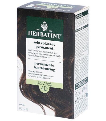 Une coloration capillaire inspirée par la nature avec une couverture à 100 % des cheveux gris ? Herbatint propose 27 nuances différentes de gels de coloration capillaire sans ammoniaque et avec une couverture à 100 % des cheveux gris. La coloration capillaire est axée sur la coloration naturelle, la nutrition et la protection optimale des cheveux. La coloration capillaire contient une formule unique et douce et est enrichie de 8 extraits de plantes, dont l'aloe vera, l'hamamélis, l'échinacée et le noyer. La formule contient également une faible concentration de peroxyde d'hydrogène. Herbatint 4D est une magnifique teinte châtain doré pour une couleur et une brillance naturelles et un résultat durable. La coloration capillaire convient pour 2 applications.Bénéfices Coloration permanente Sans ammoniaque Avec 8 extraits de plantes pour un soin optimal Convient aux végans Testé dermatologiquement, convient aux peaux sensiblesApplicationCet étui contient 1 flacon de colorant, 1 flacon de révélateur, 1 Royal Conditioner et 1 paire de gants.Mode d'emploi :Préparez : pinceau , bol en plastique ou en verre, cape de protection ou une serviette de toilette usagée, verre doseur. Il est conseillé de ne pas laver ses cheveux 24 heures avant de faire sa coloration; le sébum naturel produit par le cuir chevelu ayant une action protectrice sur celui-ci. Il est important que vos cheveux n'aient aucune trace de produits de coiffage (produits sans rinçage, baumes).1. Préparez le soin colorant permanent. Mettez les gants et protégez vos vêtemens avec la cape ou la serviette. Mélangez dans un bol la même quantité de chacun des deux flacons, couleur (flacon 1) et révélateur (flacon 2). La quantité de produit dépend de la longueur, l'épaisseur ou la porosité de vos cheveux, mais l'important est de respecter le ratio de mélange 1:1 entre couleur et révélateur. En l'absence de verre doseur vous pouvez utiliser les bouchons pour dosere la couleur et le révélateur en quantités égales.Repousse jusqu'à 2cm = 30 ml de couleur + 30ml de révélateurCheveux courts = 40 ml de couleur + 40ml de révélateurCheveux longs = 60 ml de couleur + 60ml de révélateurAprès emploi, refermez les flacons avec soin afin de conserver le produit non utilisé pour une application future.2. Séparez vos cheveux en 4 sections égales (verticalement du front vers la nuge et horizontalement d'oreille à oreille). Appliquez le soin colorant à l'aide d'un pinceau, en partant des racines. Jetez un oeil aux tutorials (https://www.youtube.com/watch?v=snZ7bTQ_DQQ).3. Laissez poser 40 minutes. Ne pas prolonger ni réduire le temps de pose. Le conseil en plus: si vous faites un retouche racines, appliquez le gel uniquement sur la repousse des cheveux et en conservez une petite quantité. Après 30 minutes de pose, appliquez le rest du mélange sur les longueurs jsqu'aux pointes et laissez poser encore 10 minutes.4. Rincez et complétez votre application. Rincez soigneusement les cheveux. Appliquez votre shampoing... ...