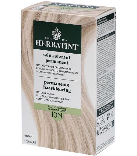 Une coloration capillaire inspirée par la nature avec une couverture à 100 % des cheveux gris ? Herbatint propose 27 nuances différentes de gels de coloration capillaire sans ammoniaque et avec une couverture à 100 % des cheveux gris. La coloration capillaire est axée sur la coloration naturelle, la nutrition et la protection optimale des cheveux. La coloration capillaire contient une formule unique et douce et est enrichie de 8 extraits de plantes, dont l'aloe vera, l'hamamélis, l'échinacée et le noyer. La formule contient également une faible concentration de peroxyde d'hydrogène. Herbatint 10N est une magnifique teinte blond platine pour une couleur et une brillance naturelles et un résultat durable. La coloration capillaire convient pour 2 applications. Bénéfices Coloration permanente Sans ammoniaque Avec 8 extraits de plantes pour un soin optimal Convient aux végans Testé dermatologiquement, convient aux peaux sensiblesApplicationCet étui contient 1 flacon de colorant, 1 flacon de révélateur, 1 Royal Conditioner et 1 paire de gants.Mode d'emploi :Préparez : pinceau , bol en plastique ou en verre, cape de protection ou une serviette de toilette usagée, verre doseur. Il est conseillé de ne pas laver ses cheveux 24 heures avant de faire sa coloration; le sébum naturel produit par le cuir chevelu ayant une action protectrice sur celui-ci. Il est important que vos cheveux n'aient aucune trace de produits de coiffage (produits sans rinçage, baumes).1. Préparez le soin colorant permanent. Mettez les gants et protégez vos vêtemens avec la cape ou la serviette. Mélangez dans un bol la même quantité de chacun des deux flacons, couleur (flacon 1) et révélateur (flacon 2). La quantité de produit dépend de la longueur, l'épaisseur ou la porosité de vos cheveux, mais l'important est de respecter le ratio de mélange 1:1 entre couleur et révélateur. En l'absence de verre doseur vous pouvez utiliser les bouchons pour dosere la couleur et le révélateur en quantités égales.Repousse jusqu'à 2cm = 30 ml de couleur + 30ml de révélateurCheveux courts = 40 ml de couleur + 40ml de révélateurCheveux longs = 60 ml de couleur + 60ml de révélateurAprès emploi, refermez les flacons avec soin afin de conserver le produit non utilisé pour une application future.2. Séparez vos cheveux en 4 sections égales (verticalement du front vers la nuge et horizontalement d'oreille à oreille). Appliquez le soin colorant à l'aide d'un pinceau, en partant des racines. Jetez un oeil aux tutorials (https://www.youtube.com/watch?v=snZ7bTQ_DQQ).3. Laissez poser 40 minutes. Ne pas prolonger ni réduire le temps de pose. Le conseil en plus: si vous faites un retouche racines, appliquez le gel uniquement sur la repousse des cheveux et en conservez une petite quantité. Après 30 minutes de pose, appliquez le rest du mélange sur les longueurs jsqu'aux pointes et laissez poser encore 10 minutes.4. Rincez et complétez votre application. Rincez soigneusement les cheveux. Appliquez votre shampoing... ...