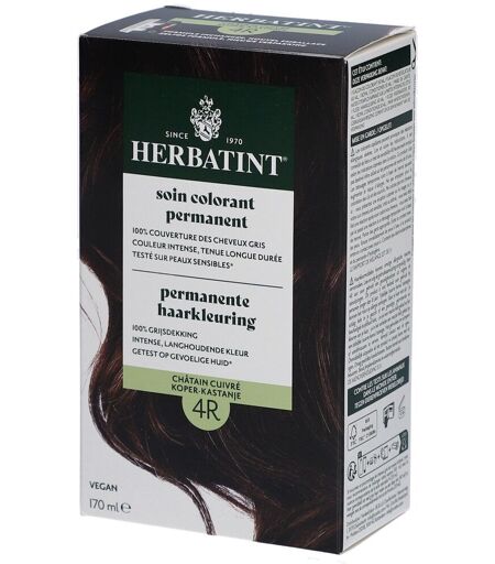 Une coloration capillaire inspirée par la nature avec une couverture à 100 % des cheveux gris ? Herbatint propose 27 nuances différentes de gels de coloration capillaire sans ammoniaque et avec une couverture à 100 % des cheveux gris. La coloration capillaire est axée sur la coloration naturelle, la nutrition et la protection optimale des cheveux. La coloration capillaire contient une formule unique et douce et est enrichie de 8 extraits de plantes, dont l'aloe vera, l'hamamélis, l'échinacée et le noyer. La formule contient également une faible concentration de peroxyde d'hydrogène. Herbatint 4R est une magnifique teinte châtain cuivré pour une couleur et une brillance naturelles et un résultat durable. La coloration capillaire convient pour 2 applications. Coloration permanente Sans ammoniaque Avec 8 extraits de plantes pour un soin optimal Convient aux végans Testé dermatologiquement, convient aux peaux sensibles L'emballage contient 1 flacon de colorant, 1 flacon de fixant, 1 mini Royal conditioner et des gants. Suivez les instructions de la notice. Conseils : Les colorants capillaires peuvent provoquer des réactions allergiques graves. Suivez les instructions. Un test de sensibilité est recommandé 48 heures avant l'utilisation. Ce produit n'est pas destiné à être utilisé par des personnes âgées de moins de 16 ans. ingrédients coloration : Laureth-4, Propylene glycol, Aqua (water), PEG-2 Oleamine, Ethanolamine, Oleic acid, p-Phenylenediamine, Aloe barbadensis (Aloe Vera) leaf juice, Hamamelis virginiana (Witch Hazel) leaf extract, Betula Alba (Birch) leaf extract, Echinacea angustifolia (Echinacea) root extract, Juglans regia (Walnut) leaf extract, Rheum Officinale stem extract, Cinchona calisaya (Cinchona) bark extract, Limnanthes alba (Meadowfoam) seed oil, 2-amino-3-hydroxypyridine, p-aminophenol, Tetrasodium glutamate diacetate, 4-Chlororesorcinol, p-methylaminophenol sulfate, Cetrimonium chloride, Sodium metabisulfite, Glycerin. ...