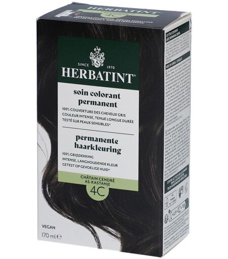 Une coloration capillaire inspirée par la nature avec une couverture à 100 % des cheveux gris ? Herbatint propose 27 nuances différentes de gels de coloration capillaire sans ammoniaque et avec une couverture à 100 % des cheveux gris. La coloration capillaire est axée sur la coloration naturelle, la nutrition et la protection optimale des cheveux. La coloration capillaire contient une formule unique et douce et est enrichie de 8 extraits de plantes, dont l'aloe vera, l'hamamélis, l'échinacée et le noyer. La formule contient également une faible concentration de peroxyde d'hydrogène. Herbatint 4C est une magnifique teinte châtain cendré pour une couleur et une brillance naturelles et un résultat durable. La coloration capillaire convient pour 2 applications. Bénéfices Coloration permanente Sans ammoniaque Avec 8 extraits de plantes pour un soin optimal Convient aux végans Testé dermatologiquement, convient aux peaux sensiblesApplicationCet étui contient 1 flacon de colorant, 1 flacon de révélateur, 1 Royal Conditioner et 1 paire de gants.Mode d'emploi :Préparez : pinceau , bol en plastique ou en verre, cape de protection ou une serviette de toilette usagée, verre doseur. Il est conseillé de ne pas laver ses cheveux 24 heures avant de faire sa coloration; le sébum naturel produit par le cuir chevelu ayant une action protectrice sur celui-ci. Il est important que vos cheveux n'aient aucune trace de produits de coiffage (produits sans rinçage, baumes).1. Préparez le soin colorant permanent. Mettez les gants et protégez vos vêtemens avec la cape ou la serviette. Mélangez dans un bol la même quantité de chacun des deux flacons, couleur (flacon 1) et révélateur (flacon 2). La quantité de produit dépend de la longueur, l'épaisseur ou la porosité de vos cheveux, mais l'important est de respecter le ratio de mélange 1:1 entre couleur et révélateur. En l'absence de verre doseur vous pouvez utiliser les bouchons pour dosere la couleur et le révélateur en quantités égales.Repousse jusqu'à 2cm = 30 ml de couleur + 30ml de révélateurCheveux courts = 40 ml de couleur + 40ml de révélateurCheveux longs = 60 ml de couleur + 60ml de révélateurAprès emploi, refermez les flacons avec soin afin de conserver le produit non utilisé pour une application future.2. Séparez vos cheveux en 4 sections égales (verticalement du front vers la nuge et horizontalement d'oreille à oreille). Appliquez le soin colorant à l'aide d'un pinceau, en partant des racines. Jetez un oeil aux tutorials (https://www.youtube.com/watch?v=snZ7bTQ_DQQ).3. Laissez poser 40 minutes. Ne pas prolonger ni réduire le temps de pose. Le conseil en plus: si vous faites un retouche racines, appliquez le gel uniquement sur la repousse des cheveux et en conservez une petite quantité. Après 30 minutes de pose, appliquez le rest du mélange sur les longueurs jsqu'aux pointes et laissez poser encore 10 minutes.4. Rincez et complétez votre application. Rincez soigneusement les cheveux. Appliquez votre shampoing... ...