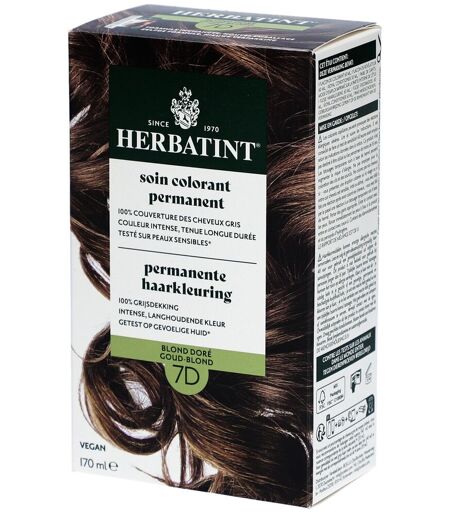 Une coloration capillaire inspirée par la nature avec une couverture à 100 % des cheveux gris ? Herbatint propose 27 nuances différentes de gels de coloration capillaire sans ammoniaque et avec une couverture à 100 % des cheveux gris. La coloration capillaire est axée sur la coloration naturelle, la nutrition et la protection optimale des cheveux. La coloration capillaire contient une formule unique et douce et est enrichie de 8 extraits de plantes, dont l'aloe vera, l'hamamélis, l'échinacée et le noyer. La formule contient également une faible concentration de peroxyde d'hydrogène. Herbatint 7D est une magnifique teinte blond doré pour une couleur et une brillance naturelles et un résultat durable. La coloration capillaire convient pour 2 applications.Bénéfices Coloration permanente Sans ammoniaque Avec 8 extraits de plantes pour un soin optimal Convient aux végans Testé dermatologiquement, convient aux peaux sensiblesApplicationCet étui contient 1 flacon de colorant, 1 flacon de révélateur, 1 Royal Conditioner et 1 paire de gants.Mode d'emploi :Préparez : pinceau , bol en plastique ou en verre, cape de protection ou une serviette de toilette usagée, verre doseur. Il est conseillé de ne pas laver ses cheveux 24 heures avant de faire sa coloration; le sébum naturel produit par le cuir chevelu ayant une action protectrice sur celui-ci. Il est important que vos cheveux n'aient aucune trace de produits de coiffage (produits sans rinçage, baumes).1. Préparez le soin colorant permanent. Mettez les gants et protégez vos vêtemens avec la cape ou la serviette. Mélangez dans un bol la même quantité de chacun des deux flacons, couleur (flacon 1) et révélateur (flacon 2). La quantité de produit dépend de la longueur, l'épaisseur ou la porosité de vos cheveux, mais l'important est de respecter le ratio de mélange 1:1 entre couleur et révélateur. En l'absence de verre doseur vous pouvez utiliser les bouchons pour dosere la couleur et le révélateur en quantités égales.Repousse jusqu'à 2cm = 30 ml de couleur + 30ml de révélateurCheveux courts = 40 ml de couleur + 40ml de révélateurCheveux longs = 60 ml de couleur + 60ml de révélateurAprès emploi, refermez les flacons avec soin afin de conserver le produit non utilisé pour une application future.2. Séparez vos cheveux en 4 sections égales (verticalement du front vers la nuge et horizontalement d'oreille à oreille). Appliquez le soin colorant à l'aide d'un pinceau, en partant des racines. Jetez un oeil aux tutorials (https://www.youtube.com/watch?v=snZ7bTQ_DQQ).3. Laissez poser 40 minutes. Ne pas prolonger ni réduire le temps de pose. Le conseil en plus: si vous faites un retouche racines, appliquez le gel uniquement sur la repousse des cheveux et en conservez une petite quantité. Après 30 minutes de pose, appliquez le rest du mélange sur les longueurs jsqu'aux pointes et laissez poser encore 10 minutes.4. Rincez et complétez votre application. Rincez soigneusement les cheveux. Appliquez votre shampoing habituel... ...