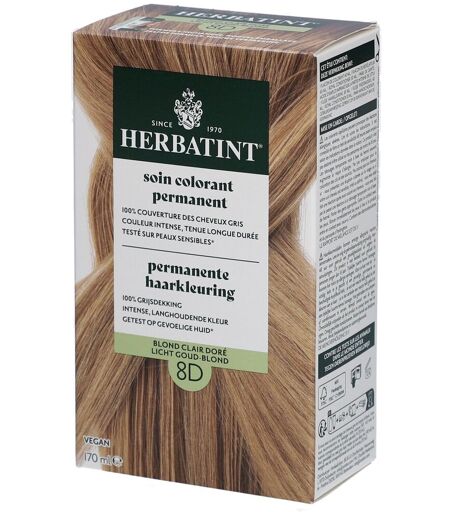 Une coloration capillaire inspirée par la nature avec une couverture à 100 % des cheveux gris ? Herbatint propose 27 nuances différentes de gels de coloration capillaire sans ammoniaque et avec une couverture à 100 % des cheveux gris. La coloration capillaire est axée sur la coloration naturelle, la nutrition et la protection optimale des cheveux. La coloration capillaire contient une formule unique et douce et est enrichie de 8 extraits de plantes, dont l'aloe vera, l'hamamélis, l'échinacée et le noyer. La formule contient également une faible concentration de peroxyde d'hydrogène. Herbatint 8D est une magnifique teinte blond clair pour une couleur et une brillance naturelles et un résultat durable. La coloration capillaire convient pour 2 applications.Bénéfices Coloration permanente Sans ammoniaque Avec 8 extraits de plantes pour un soin optimal Convient aux végans Testé dermatologiquement, convient aux peaux sensiblesApplicationCet étui contient 1 flacon de colorant, 1 flacon de révélateur, 1 Royal Conditioner et 1 paire de gants.Mode d'emploi :Préparez : pinceau , bol en plastique ou en verre, cape de protection ou une serviette de toilette usagée, verre doseur. Il est conseillé de ne pas laver ses cheveux 24 heures avant de faire sa coloration; le sébum naturel produit par le cuir chevelu ayant une action protectrice sur celui-ci. Il est important que vos cheveux n'aient aucune trace de produits de coiffage (produits sans rinçage, baumes).1. Préparez le soin colorant permanent. Mettez les gants et protégez vos vêtemens avec la cape ou la serviette. Mélangez dans un bol la même quantité de chacun des deux flacons, couleur (flacon 1) et révélateur (flacon 2). La quantité de produit dépend de la longueur, l'épaisseur ou la porosité de vos cheveux, mais l'important est de respecter le ratio de mélange 1:1 entre couleur et révélateur. En l'absence de verre doseur vous pouvez utiliser les bouchons pour dosere la couleur et le révélateur en quantités égales.Repousse jusqu'à 2cm = 30 ml de couleur + 30ml de révélateurCheveux courts = 40 ml de couleur + 40ml de révélateurCheveux longs = 60 ml de couleur + 60ml de révélateurAprès emploi, refermez les flacons avec soin afin de conserver le produit non utilisé pour une application future.2. Séparez vos cheveux en 4 sections égales (verticalement du front vers la nuge et horizontalement d'oreille à oreille). Appliquez le soin colorant à l'aide d'un pinceau, en partant des racines. Jetez un oeil aux tutorials (https://www.youtube.com/watch?v=snZ7bTQ_DQQ).3. Laissez poser 40 minutes. Ne pas prolonger ni réduire le temps de pose. Le conseil en plus: si vous faites un retouche racines, appliquez le gel uniquement sur la repousse des cheveux et en conservez une petite quantité. Après 30 minutes de pose, appliquez le rest du mélange sur les longueurs jsqu'aux pointes et laissez poser encore 10 minutes.4. Rincez et complétez votre application. Rincez soigneusement les cheveux. Appliquez votre shampoing habituel... ...