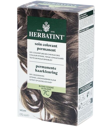 Une coloration capillaire inspirée par la nature avec une couverture à 100 % des cheveux gris ? Herbatint propose 27 nuances différentes de gels de coloration capillaire sans ammoniaque et avec une couverture à 100 % des cheveux gris. La coloration capillaire est axée sur la coloration naturelle, la nutrition et la protection optimale des cheveux. La coloration capillaire contient une formule unique et douce et est enrichie de 8 extraits de plantes, dont l'aloe vera, l'hamamélis, l'échinacée et le noyer. La formule contient également une faible concentration de peroxyde d'hydrogène. Herbatint 7C est une magnifique teinte blond cendré pour une couleur et une brillance naturelles et un résultat durable. La coloration capillaire convient pour 2 applications. Bénéfices Coloration permanente Sans ammoniaque Avec 8 extraits de plantes pour un soin optimal Convient aux végans Testé dermatologiquement, convient aux peaux sensiblesApplicationCet étui contient 1 flacon de colorant, 1 flacon de révélateur, 1 Royal Conditioner et 1 paire de gants.Mode d'emploi :Préparez : pinceau , bol en plastique ou en verre, cape de protection ou une serviette de toilette usagée, verre doseur. Il est conseillé de ne pas laver ses cheveux 24 heures avant de faire sa coloration; le sébum naturel produit par le cuir chevelu ayant une action protectrice sur celui-ci. Il est important que vos cheveux n'aient aucune trace de produits de coiffage (produits sans rinçage, baumes).1. Préparez le soin colorant permanent. Mettez les gants et protégez vos vêtemens avec la cape ou la serviette. Mélangez dans un bol la même quantité de chacun des deux flacons, couleur (flacon 1) et révélateur (flacon 2). La quantité de produit dépend de la longueur, l'épaisseur ou la porosité de vos cheveux, mais l'important est de respecter le ratio de mélange 1:1 entre couleur et révélateur. En l'absence de verre doseur vous pouvez utiliser les bouchons pour dosere la couleur et le révélateur en quantités égales.Repousse jusqu'à 2cm = 30 ml de couleur + 30ml de révélateurCheveux courts = 40 ml de couleur + 40ml de révélateurCheveux longs = 60 ml de couleur + 60ml de révélateurAprès emploi, refermez les flacons avec soin afin de conserver le produit non utilisé pour une application future.2. Séparez vos cheveux en 4 sections égales (verticalement du front vers la nuge et horizontalement d'oreille à oreille). Appliquez le soin colorant à l'aide d'un pinceau, en partant des racines. Jetez un oeil aux tutorials (https://www.youtube.com/watch?v=snZ7bTQ_DQQ).3. Laissez poser 40 minutes. Ne pas prolonger ni réduire le temps de pose. Le conseil en plus: si vous faites un retouche racines, appliquez le gel uniquement sur la repousse des cheveux et en conservez une petite quantité. Après 30 minutes de pose, appliquez le rest du mélange sur les longueurs jsqu'aux pointes et laissez poser encore 10 minutes.4. Rincez et complétez votre application. Rincez soigneusement les cheveux. Appliquez votre shampoing... ...