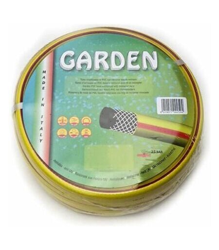 Tubo gomma giardino canna acqua 3/4 " x 25 mt Made in Italy rinforzato irrigazione casa orto giardino cantiere. tubo Made in Italy in pvc multistrato rinforzato con filato in poliestere ad alta tenacità. l'interno non trasparente previene la formazione di alghe. considerato lo spessore paretale il tubo ha proprietà meccaniche uniche ed è resistente alle deformazioni e alle rotture. disponibile giallocon banda rossa (alta resistenza) applicazioni: orticoltura giardinaggio e passaggio acqua in genere colore: giallo diametro interno: da 1/2" (12,5mm)- 5/8" (15mm)- 3/4"(19mm) - 1"(25mm) pressione d'esercizio: max.25 bar ...