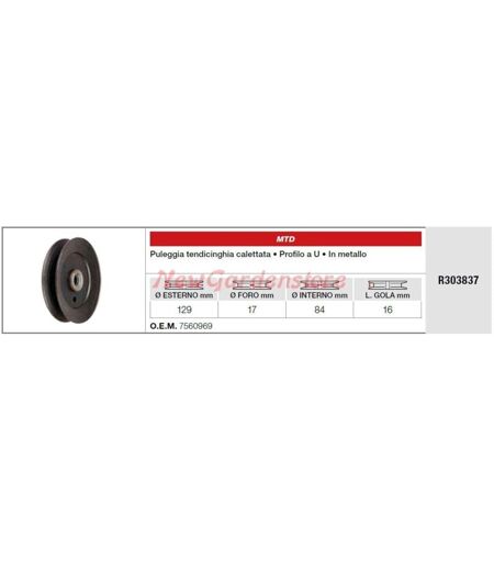 Poulie tendeur de courroie avec profil métallique en U pour tracteur de pelouse tondeuse Ø extérieur : 129mm Diamètre du trou : 17mm Ø intérieur : 84mm Longueur de la gorge : 16 mm MTD Code : R303837 Code original : 7560969 AT ...