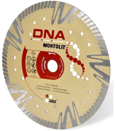 DISQUE DE DIAMANT 230 MM POUR GRANIT PIERRE DURE BÉTON BATIMENT GRÈS CÉRAME MONTOLIT DNA TXH230 Lames de diamants "TURBO" Utilisation: Utilisation sèche et humide Diamètre de la bande de hauteur: 13mm Matériau: pierre dure, granit, béton, porphyre, porcelaine haute épaisseur Application: granit, pierres dures, béton, matériaux de construction, porcelaine haute épaisseur Performance: Vitesse: haute Terminer: bon Durée de vie: haute Utilisation: angle / broyeur flexible Lames renouvelables avec art abrasif en pierre.395B DNA est une technologie innovante qui consiste en une "distribution particulière en réseau tridimensionnelle contrôlée" des granulés de diamant contenus à l'intérieur de la partie coupante des outils. Dans la pratique et plus simplement, cela signifie que les concepteurs, une fois la concentration idéale déterminée (quantité optimale de diamants dans les mélanges de poussières métalliques qui seront ensuite soumises à un frittage) pourront ensuite "disposer" chaque ...