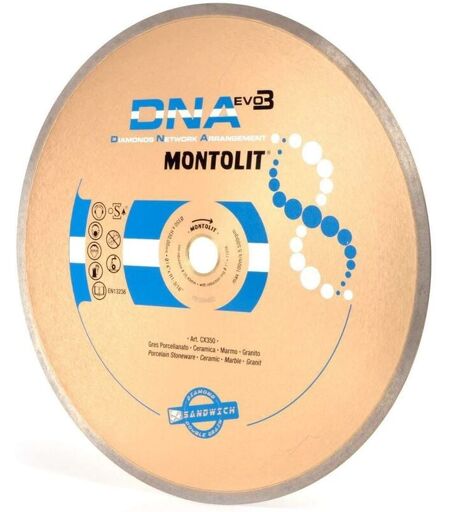 DISQUE DE DIAMANT 350 MM POUR GRÈS EMAILLÉ ET DELICAT MARBRE GRANITE MONTOLIT DNA CX350 Caractéristique principale: coupe moulue en diamant à double couche - le bord de coupe principal a un grain de diamant moyen pour une action de coupe rapide, tandis que les parties latérales de la couronne ont un grain de diamant fin afin d'obtenir une finition découpée de haute qualité. Utilisation: lame de diamant humide Matériaux: porcelaine de Gres, carreaux de céramique, granit, marbre et verre Applications: pose de carreaux dans des contextes nécessitant une excellente finition Performance Vitesse de coupe: moyenne Finition: excellent Durée: haute Équipement: banc de sciage, coupe-tuiles électriques avec de l'eau La restauration de la lame de diamant est facile avec l'art de la pierre de dressage. 395B I I DNA est une technologie innovante qui consiste en une "distribution particulière en réseau tridimensionnelle contrôlée" des granulés de diamant contenus à l'intérieur de la partie coupante ...