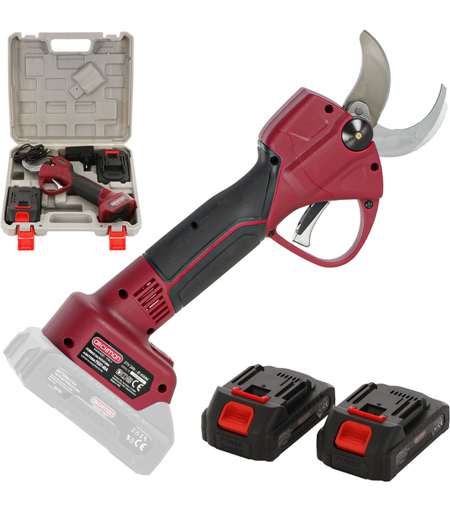 Poids sécateur 1000g, Batterie incorporée, Utilisation manuelle, Équipement avec batterie, Type de moteur électrique à induction, Type de batterie lithium (Li-Ion), Voltage 21V, Ampères batterie 2Ah, Indicateur batterie, Nombre de batteries 2, 180, Ø Branche - Max 40mm, No. Ouvertures de lame 2, Bypass, Type d'Electronique Intégrée sur le sécateur, Écran LCD, Étui pour sécateurs, Batterie partagée multi-outils, Malette ...