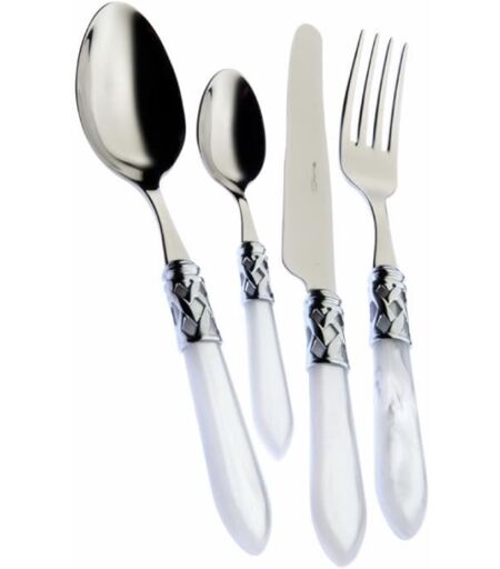"Modèle Aladdin conditionné dans une boîte Gallery, poignée disponible en différentes couleurs, finition embout chromé L'ensemble de 31 pièces comprend: 6 cuillères à soupe 6 fourchettes de table 6 couteaux de table 6 cuillères à café 6 fourchettes ...