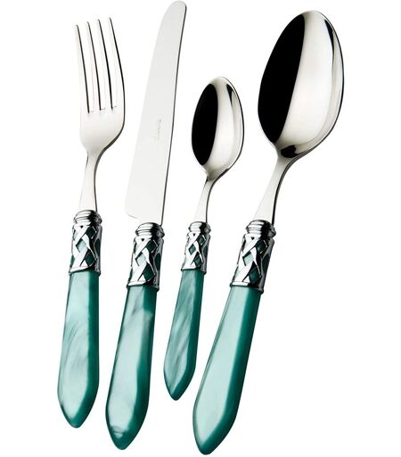 Bugatti, Aladdin, Set De 24 Couverts En Acier Inoxydable 18/10, Anneau Chromé Et Manche Vert Eau Avec Effet Nacré. Ensemble 6 Personnes: 6 Cuillères, 6 Fourchettes, 6 Couteaux Et 6 Cuillères À Café