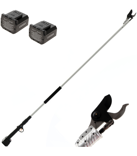 Poids sécateur 1800g, Pays de fabrication Chine, Longueur de perche 200cm, Utilisation sur perche, Équipement avec batterie, Type de moteur à batterie, Type de batterie lithium (Li-Ion), Voltage 21.6V, Ampères batterie 4Ah, Indicateur batterie, Nombre de batteries 2, Ampères disponibles 8Ah, Voltage effectif 21.6V, Ø Branche - Max 38mm, No. Ouvertures de lame 1, Bypass, Type d'Electronique Intégrée sur le sécateur ...