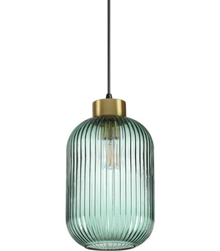 Cadre métallique avec finition en laiton satin et rosette noire mate. Câble recouvert de tissu. Diffuseur en verre blond avec bande en relief. Disponible en fumée ou en finitions vertes. Ø 14 x H min 48,5 / max 223,5 cm E27 max 1 x 60W IP:20 ...
