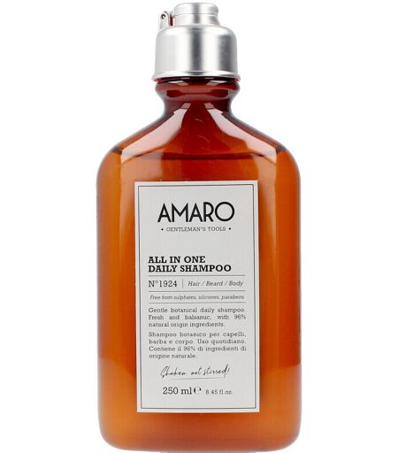 AMARO all in one daily shampoo nº1924 hair/beard/body. Soin de la barbe - Shampooing hydratant - Savon parfumé. Type de peau: Tous types de peaux. Type de cheveux: Tous types de cheveux. Formulation: Sans paraben, Sans sulfate, Sans alcool. Propriétés: Rafraîchissantes ...