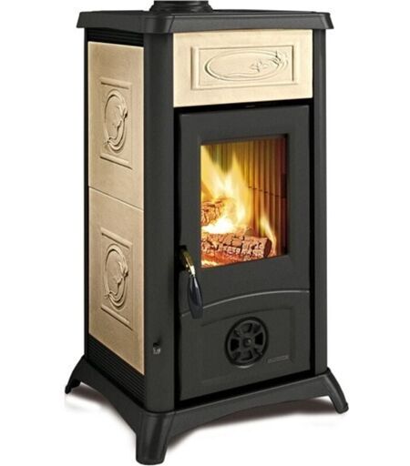 Poele a' bois La Nordica Extraflame Revetement exte'rieur Gemma en parchemin antique liberty coloris majolique 6 kw 172 m chauffe' ...