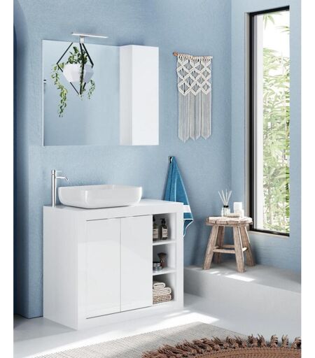 3Suisses : Le meuble salle de bain 3S. x Home Bari affiche une prestance inégalée avec son allure authentique. Sa couleur blanc laqué brillant donne une brillance incomparable. Fabriqué en contreplaqué (MDF), ce meuble équipé de 2 portes larges offre un généreux espace de rangement. De plus, trois niches ouvertes y sont adroitement juxtaposées. Le tout surmonté par une vasque élégamment posée, agencée de façon symétrique, cette structure en largeur 92cm se tient fièrement sur quatre solides pieds. Son aspect pratique et esthétique en fait un incontournable de votre salle de bain. Robinet non compris Marque: 3S. x Home ...