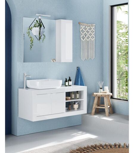 3S. x Home Meuble salle de bain Bari suspendu Blanc laqué 2 Portes 2 niches vasque à poser unisex