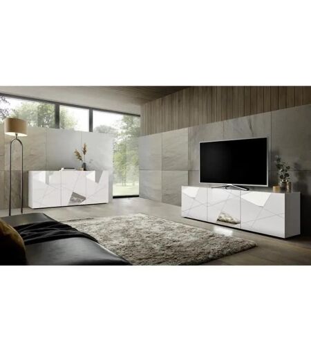 Ensemble Sejour VICTORY : Buffet 3P 181 cm + Meuble TV 181 cm - Style contemporain / Design - L181xP42xH84 cm - L181xP43xH57 cm. Structure en panneau de particules, coloris blanc laqué brillant avec sérigraphie miroir, finition laquée brillante haute densité avec traitement anti rayure et anti jaunissement. ...