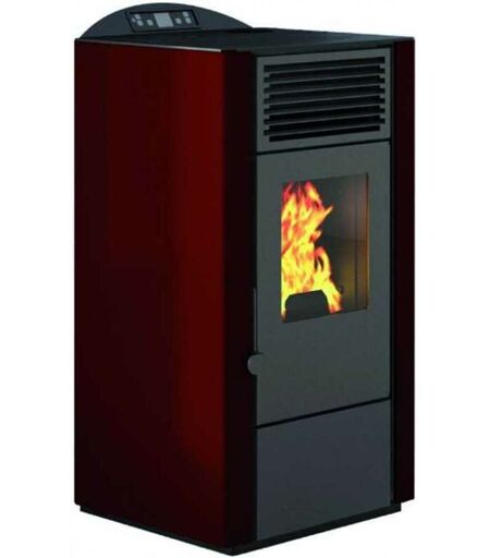 Poêle à granulés rouge, avec évacuation arrière ou supérieure et d'une puissance brûlée de 9Kw, il satisfait aux réglementations les plus restrictives en matière environnementale et a obtenu 4 étoiles en classification environnementale. Données techniques : Puissance de sortie en chauffage : max 7,5 kW – min 2,5 kW ; Efficacité : Pmax 85,5 % – Pmin 90 % ; Valeur CO avec 13% O2 (%) : Pmax 0,016 % - Pmin 0,013 % ; Consommation horaire de pellets : max 1,8 kg/h – min 0,6 kg/h ; Capacité du réservoir : 13,5 kg ; Taille de la pièce pouvant être chauffée : 140 – 200 mètres cubes ; Distances minimales des murs inflammables : côté : 25 cm - arrière : 10 cm - avant : 100 cm ; Alimentation : 230V – 50Hz ; Puissance nominale électrique : 320 W ; Dimensions : L 46 x P 51,6 x H 96,1 cm ; Poids : 59,7 kg ; Chambre en acier ; Conforme aux normes : EN14785 - BImSchV II - 15a B-VG - LRV/VKF. Le tiroir de récupération des cendres est amovible. La télécommande, le module GPRS pour l'allumage à distance, ...